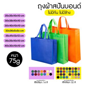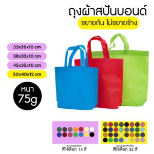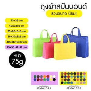 สำหรับลูกค้าที่สนใจจัดทำกระเป๋าเพื่อประชาสัมพันธ์และเพื่อแจกทำการตลาด กระเป๋าผ้าสปันบอนด์ ถือเป็นกระเป๋าที่เหมาะสมอย่างยิ่งที่เราแนะนำ เนื่องจากราคาที่ไม่สูงมากนักและการพกพาง่ายเหมาะกับทุกสถานการณ์ จึงเป็นชนิดผ้าที่เราแนะนำ